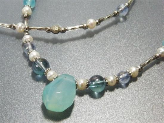 シーブルーカルセドニー6mm玉、アクアオーラ8mm玉、淡水パール5mm玉、