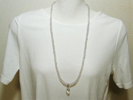 マダガスカル・ローズクォーツ6mm、全長約70cm、水晶勾玉18mm、銀色カニ爪クラスプ、