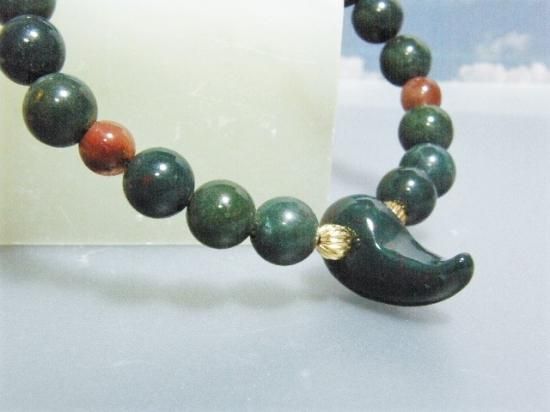 碧玉の英語名はグリーンジャスパー。メノウの近縁種です。勾玉とビーズともに同色同質のジャスパーが出雲地方に産出したため、出雲石とよぶこともあります。弥生時代から古墳時代にかけて、出雲石からたくさんの勾玉や管玉が作られ日本列島各地に運ばれていきました。出雲石は開運・蓄財をもたらす霊石とされてきました。果実玉の反対側に組みいれてあるのはシトリン多面体ビーズ、金運獲得の守護石です。アウトレット価格での販売は超がつくほどにお買い得です。写真に写っている獣型勾玉や翡翠原石は製品に付属していません。