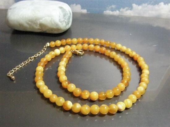 サイズ:ハニーアンバー約6mm玉、全長約45cm、金色カニ爪クラスプ、5cmジャスター付き、
