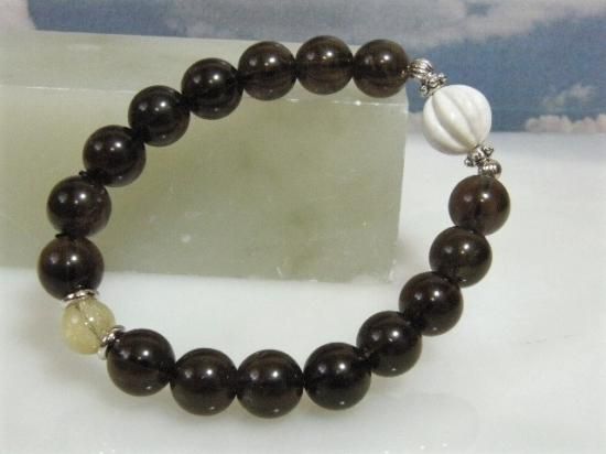スモーキークォーツ・ビーズは黒水晶大珠などの製作時に、いっしょに注文製作した自社製品です。中国山東省産黒(茶)水晶はネガティブな「気」を吸着して浄化すると評判のパワーストーンです。本品は中央に当社特注の日本翡翠果実玉を1個組んであります。果実玉の反対側にあるのはルチルクォーツ。金運を招くお守りになります。バーゲン価格での販売は大変お買い得です。写真に写っている獣型勾玉や原石は製品に付属していません。お送りするのはブレスレット本体のみです。