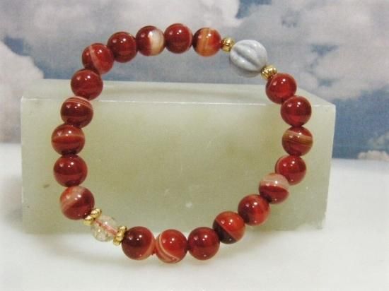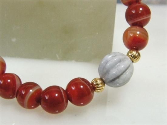 写真ではわかりにくのですが、本品で使用している日本翡翠果実玉は灰色混じりの藤色をしたラベンダージェードです。貴重な製品です。赤白のメノウはサードオニックスの別名があって、男女の仲を深めるパワーストーンとされていました。果実玉の反対側にあるのはルチルクォーツ。金運を招くお守りです。バーゲン価格での販売は大変お買い得です。写真に写っている獣型勾玉や原石は製品に付属していません。お送りするのはブレスレット本体のみです。