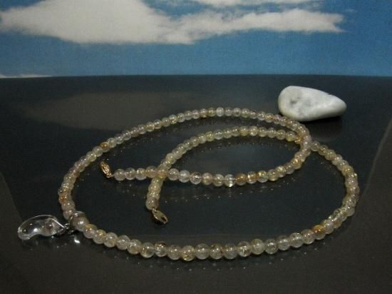 サイズ:ルチルクォーツ6mm玉、70cm、銀色クリッカーに水晶小勾玉約18x12x7mm付き。