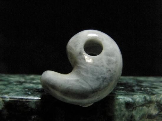 古代には日本の国土を豊葦原中津国(とよあしはらなかつくに)とよんだように、葦は特別視されていて、葦の若芽(アシカビ)は成功をもたらすパワーの象徴とされていました。新芽勾玉はアシカビをデザイン化した小型勾玉です。愛用することで道が開けるよう手助けしてくれると思います。写真の獣型勾玉は製品に付属していません。最後の写真のように根付け紐を付けてお送りします。根付け紐の色の選択は当社におまかせください。日本翡翠はPCやスマホでの色再現がむつかしく、モニターによっても多少色合いが異なります。ご理解いただければと思います。