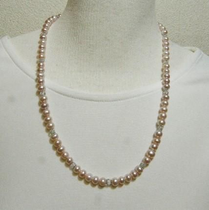 サイズ:淡水パールポテトシェイプ約7-6x5mm、水晶ファセットカット約4x3mm、銀色メタルスペーサー、全長約51cm。銀色カニ爪クラスプ、と5cmアジャスター。気持ち赤味のある淡水パールとファセットカットした水晶ビーズを組みあわせたネックレスです。