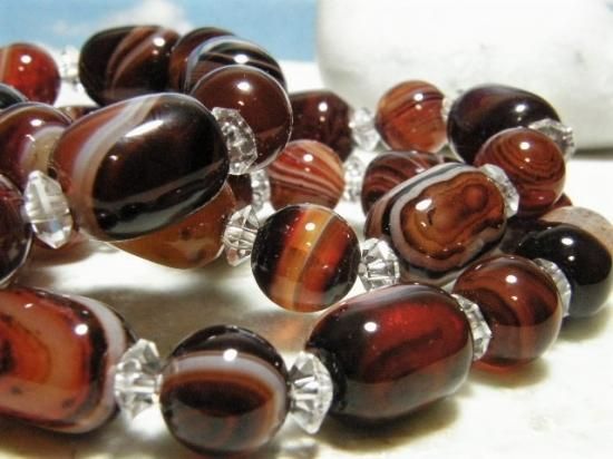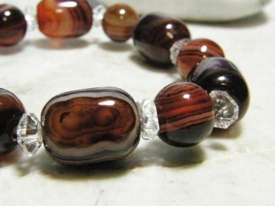 サイズ:チベット産シマ瑪瑙(メノウ)のシリンダー型約13x10mmと約10mm、ファセットカットした水晶5x3mmを交互に結んであります。オペロンゴム(ポリウレタン)結び。濃赤色と黒色とが入りまじった幻想的でパワー効果の高いメノウを使用しています。メノウは古来七宝のひとつに数えられてきて、富を招く呼び水になるといわれてきました。