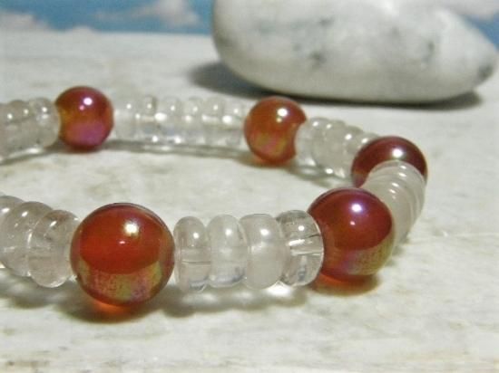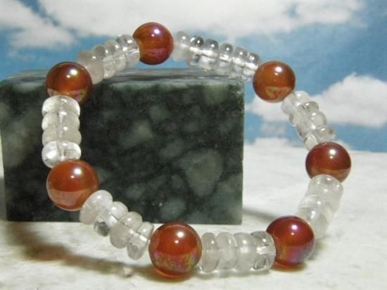 サイズ:水晶ロンデル(円盤状ビーズ)は径7-6mm、厚さ2-3mm。赤メノウ10mm玉はオーロラ水晶同様にコーティングしてあります。内径約16cm。オペロンゴム(ポリウレタン)結び。赤は持ち主のパワーを高めて魔を近寄りにくくし、不幸・不運を遠ざける色、古来辟邪(へきじゃ)の色とされてきました。気持ちが明るくなって元気になれるブレスレットです。