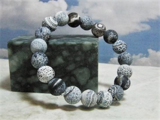 サイズ:風花メノウ10mm玉、全長約18mm。オペロンゴム(ポリウレタン)結び。風花(かざはな)メノウは天然メノウを特殊処理して、藍染めの風合いに仕上げた珍しい製品です。ブレスレットに組むと民芸品のような格調高い仕上がりになりました。あまり流通していない珍品と思います。