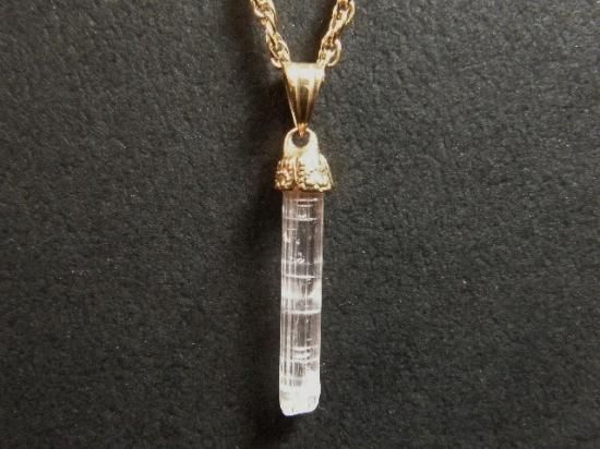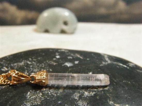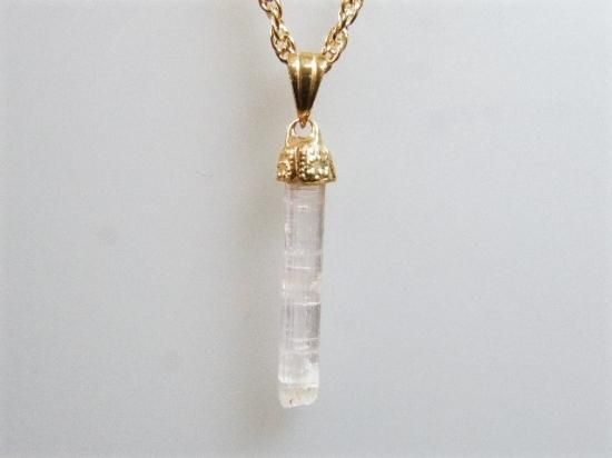サイズ:約22mm、太さ約4mm。パキスタン産のピンク・トルマリンに特注制作した18Kゴールドのキャップをかぶせたシンプル・ペンダントです。未染色未処理の天然石製品です。ピンク・トルマリンの細い柱状結晶は、色合いが淡く透明に近い感触です。淡いピンク色はとてもおしゃれです。写真の獣型勾玉やチエーン、原石類は製品に付属していません。