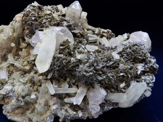 サイズ:約220x130x70mm、2.17kg。 ユニークな形状で知られる四川省美姑(スーチョワン・メイグー)産の水晶クラスターを、定価の5割引のアウトレット価格でお送りします。この産地の水晶は地質学的にも興味深く、海外のコレクターから注目されています。このクラスターでは水晶とエピドートが乱れ咲き庭園のような風景を作っています。
