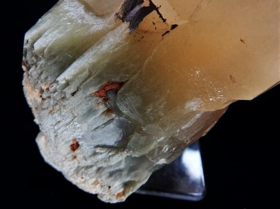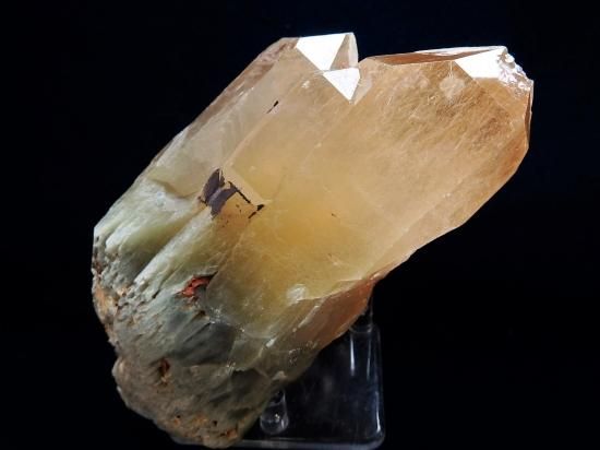 サイズ:約135x68x74mm、625g。ブラジル産の角閃石いり水晶ポイントです。角閃石にはいろいろな種類があって、色彩も濃緑色、橙色、黒色とさまざまです。イエロールチルやレッドルチルの商品名で流通しているビーズも大部分はこうした角閃石を内包した水晶です。この標本のように天然のままでダメージが少なく、ポイントがくっきりしていて大サイズのものは滅多に見つかりません。標本価値が高い製品で定価のままでも安すぎるほどです。根元のほうに角閃石が露出していますが石英が浸透しているので離散しません。