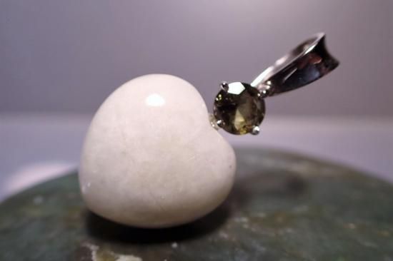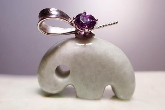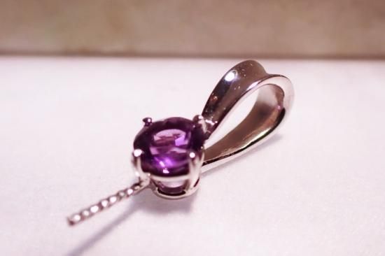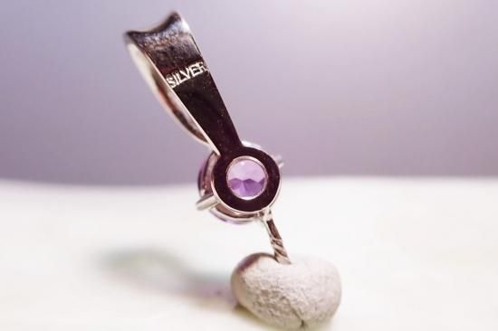 当社特注品のシルバー925のバチカンで、直径6mmのアメシストがついています。ロジウム・プレーティングしてありますので、長期間変色しません。0.8mmの片穴のルースに2液のボンドなどで接着して使用します。写真に写っている獣型勾玉は製品に付属していません。最後の写真は日本翡翠ハートカットを付けた場合のサンプルです。