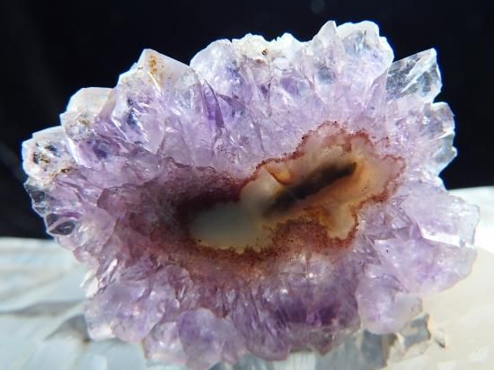 サイズ:約36x30x4mm、9g。 ウルグアイ産。スタラクタイト・アメシストは鍾乳石状アメシストの意味で、小粒の群晶が棒状に発達していて、大きなポッキーのように見えます。これを輪切りにしたものが、これらの製品です。スタラクタイト・アメシストはたいがいはメノウを核に育ちます。鍾乳洞のような環境でカルサイト(方解石)が析出するように水晶が育って、こうした鍾乳石状の水晶が誕生します。鍾乳石は1cm育つのに100年といわれているので、スタラクタイト・アメシストができるのにも相当に長い年月がかかっていると思われます。