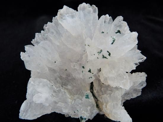サイズ:約71x63x37mm、148g。 ブラジル産。水晶の変わり種のひとつで、放射状に花弁を並べたような形をしています。通常のペンシルスタイルの水晶ポイントとは似ても似つかない形状なので、水晶とは異なる鉱物のようにみえます。岩石の隙間に染み出した熱水から析出するので、六角柱という立体を育てられず、板状になりやすいといいます。石灰岩の隙間にできることが多いと聞いています。皿状のものもあれば、花弁が幾層にも重なったものもあります。紫味の有無にかかわらずフラワーアメシストと呼んでいます。パワー効果として男女の縁をとりもつといわれています。水晶には想像を絶するほどいろいろな形があって、形状や色に魅了されてしまいます。