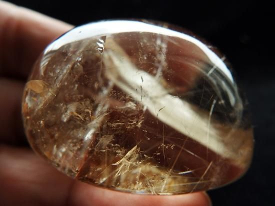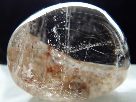 サイズ:約45x37x26mm、62g。ブラジル産。底面についた酸化鉄(ゲーサイト・針鉄鉱の仲間?)と水晶内部のクラックがあいまってガーデンクォーツのようになっていて、よくみると髪の毛程度に細いルチルを数本見ることができます。