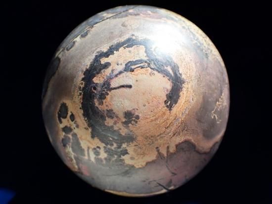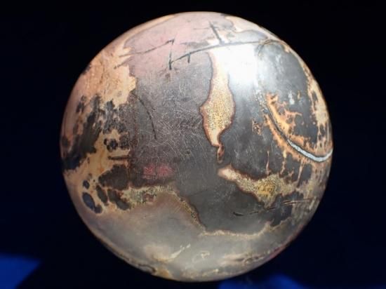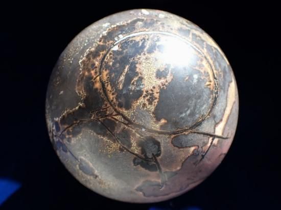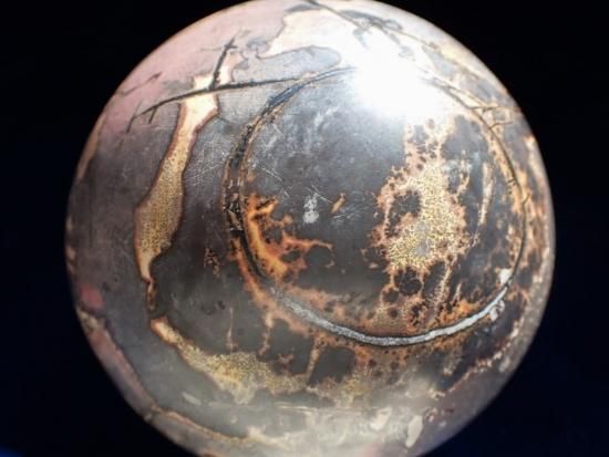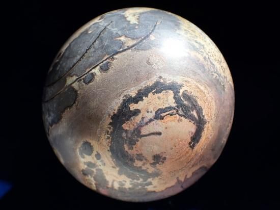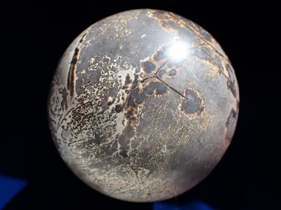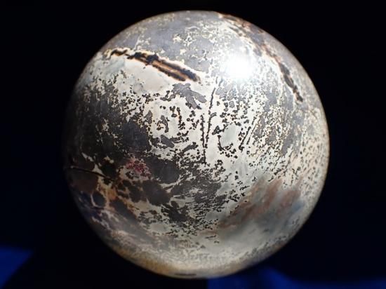 サイズ:直径約84mm、745g。 原石の産地は中国の広西省。4億5千万年前に形成された岩石だそうです。デンドライトはマンガンや赤鉄鉱の結晶が樹枝状に発達したものをいいます。メノウや流紋岩、石灰岩などの隙間や表面に発達することが多く、原石内部にとりこまれてデンドリックストーンになっていきます。和名はシダ植物のシノブからの連想で「忍石」といいます。