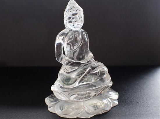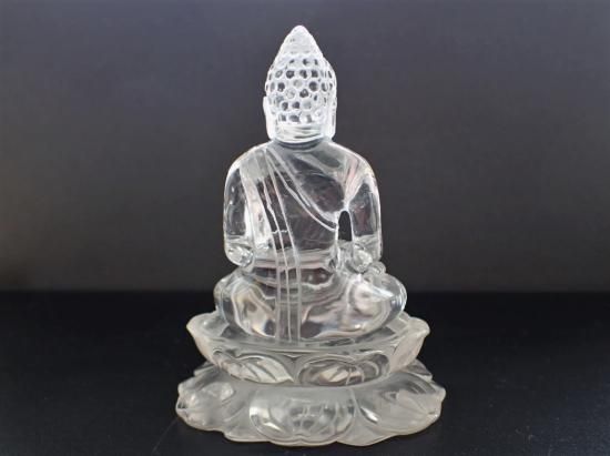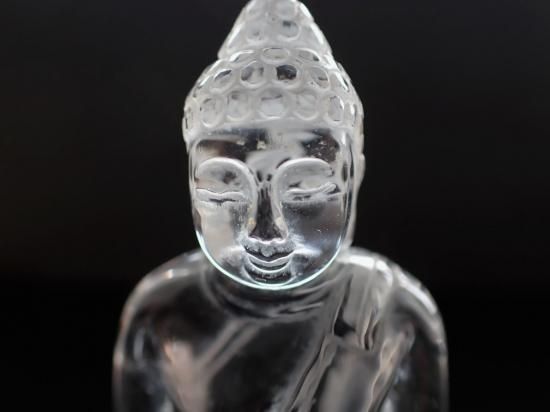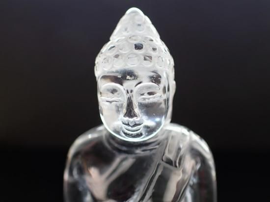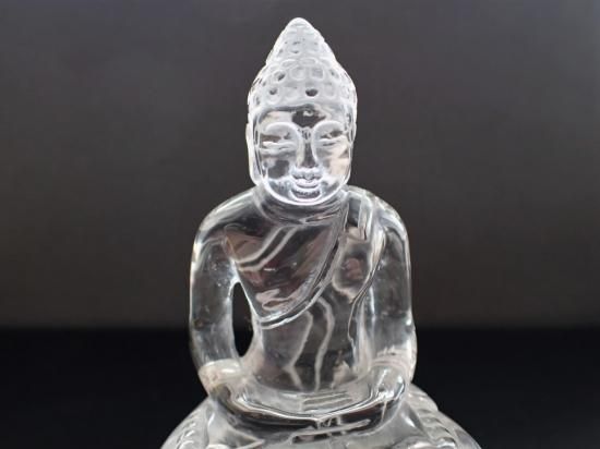 サイズ:約90x68x56mm、182g。 ブラジル産水晶を使って香港の天然石加工品専門会社が制作したクリスタルブッダ像です。ボロブドールのブッダ像を参考に制作依頼した当社のオリジナル製品です。完全無傷ではありませんが、クラックが少ない原石を使用しています。彫刻に適した大サイズの水晶原石の入手は難しく、大陸での加工賃も高くなった現在では、このような製品の制作は困難になっています。水晶製品のお顔の撮影はうまくいきませんが、美品です。