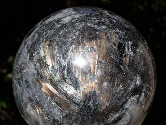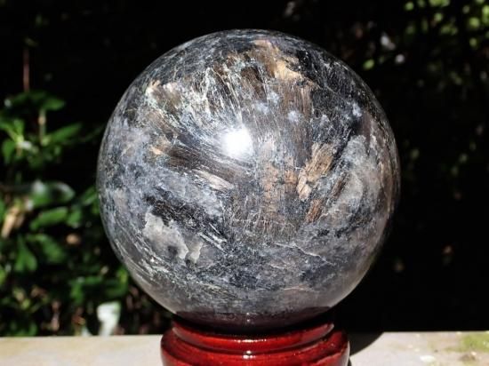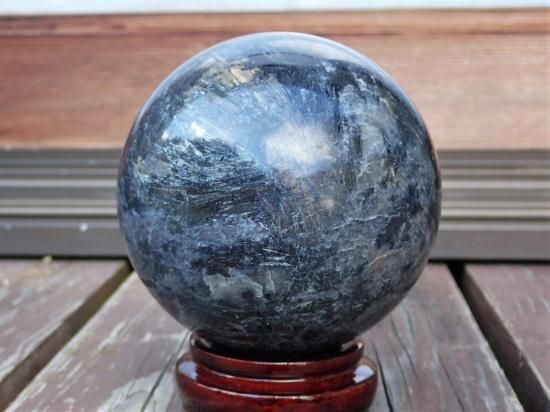 サイズ:直径約110mm 、2,000g。中国産原石を使用しています。濃紺色の地にルチルクォーツのような光線の当たり具合によって、金色にも藍色にも見える針状結晶の束が浮かび上がります。出回り始めたころはヌーマイトといわれていましたが、角閃石の一種のアルベゾナイト(アルベゾン閃石)に該当するようです。パワーに敏感な人たちの間で人気があり、占いの的中率が向上するなどといわれています。オカルト的パワーが強いので、将来は値上がりすると思います。