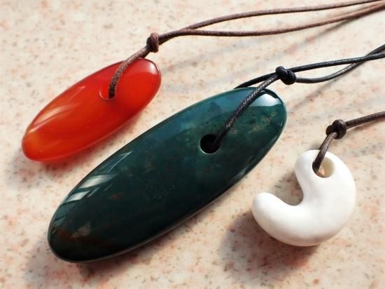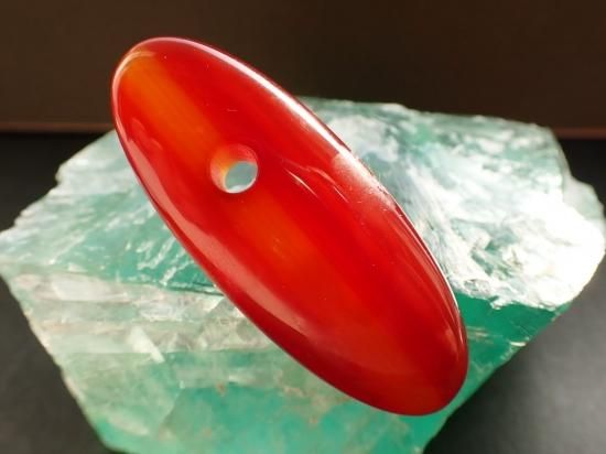 細長い楕円形をした大珠(たいしゅ)の原形は縄文時代に翡翠で作られました。世界初のヒーリングアイテムだったと考えています。最後の写真はペンダントにした場合のイメージ写真です。写真に写っているフローライト原石は製品に付属していません。お送りするのは大珠本体のみです。