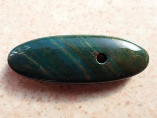 グリーンジャスパーに濃緑色に赤いまだら模様が入ったものをブラッドストーンとよぶことがあります。細長い楕円形をした大珠(たいしゅ)の原形は縄文時代に翡翠で作られました。世界初のヒーリングアイテムだったようです。