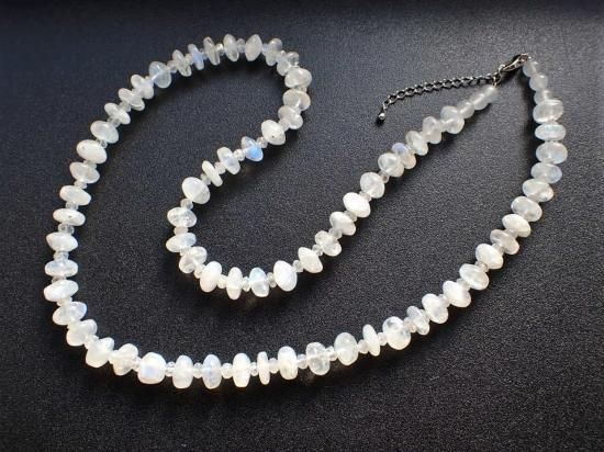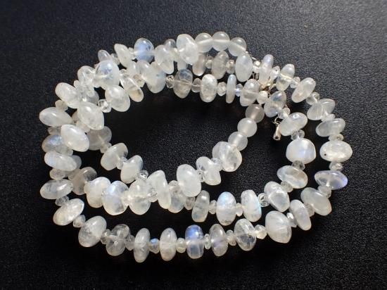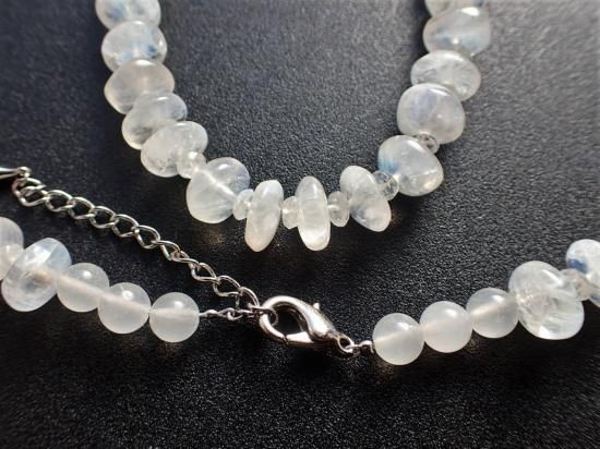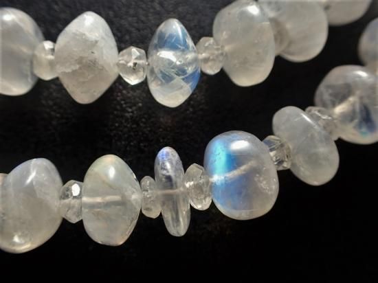 サイズ:約9mmのラフカットと4mmファセットカット・ビーズ交互。長さ約50cm。銀色カニツメクラスプ+5cmアジャスター。ビーズはおおむね円盤状で、3-4mmの厚さ。インド産原石を使用。透明度の高いムーンストーン・ビーズのあちこちに青い蛍光色がふいに閃いて、ため息がでてしまうブルームーンストーンのネックレスです。黄色などが閃く部分もあって、ムスームーンストーン特有のシラー効果は4mmビーズの部分でも楽しめます。ムーンストーンは劈開性の強い宝石なので、取り扱いにご注意ください。