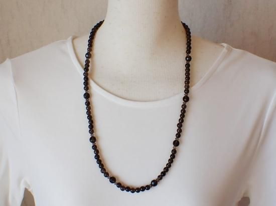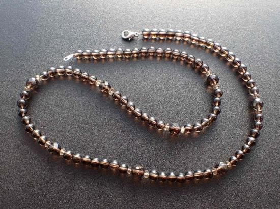 サイズ:スモーキークォーツ6mm+8mm多面体カット+4mmファセットカット。長さ約60cm。銀色カニツメクラスプ。