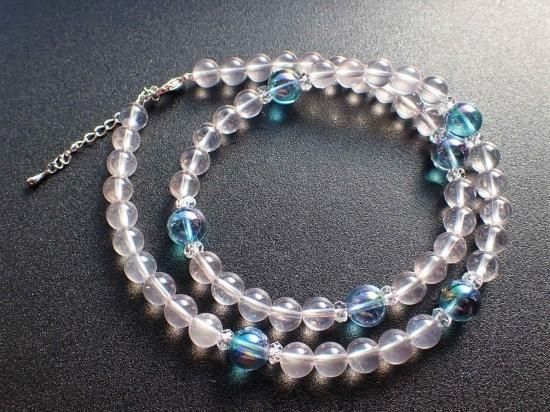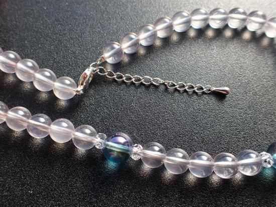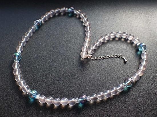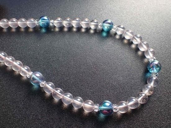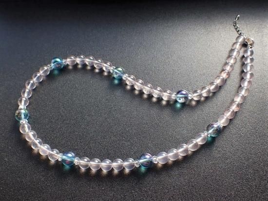 サイズ:マダガスカル・ローズクォーツ8mm+アクアオーラ・クリスタル10mm玉。長さ約50cm。銀色カニツメクラスプ+5cmアジャスター。マダガスカル産のローズクォーツは透明度が高く、傷が少なく、とびっきりやさしい色合いをしています。桜の花のエッセンスを水に溶かしたような色味が魅力的です。小さなビーズでは識別が困難かもしれませんが、透過光でみると6条の光の筋をみられるものがあります。ローズクォーツは癒しのパワーストーン。過去の失敗やつまづきが遠因となって、自己表現を妨げているというような場合、古傷を癒して、前向きになれるよう力添えしてくれます。