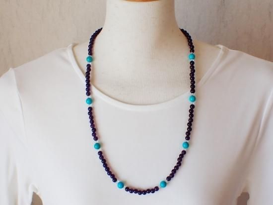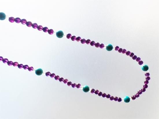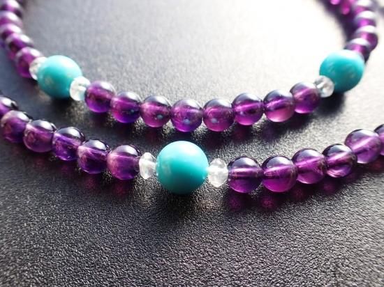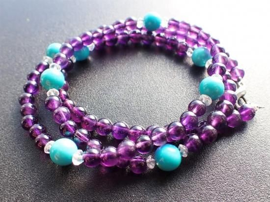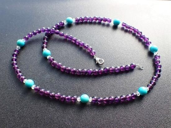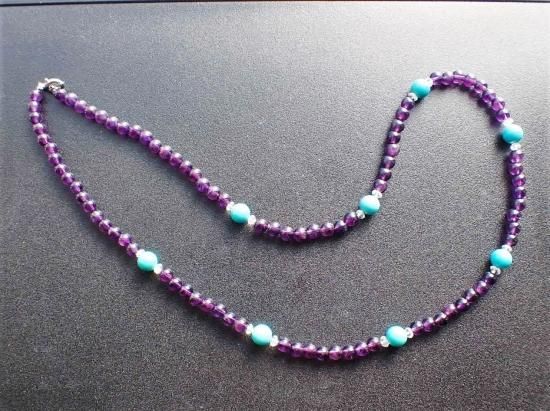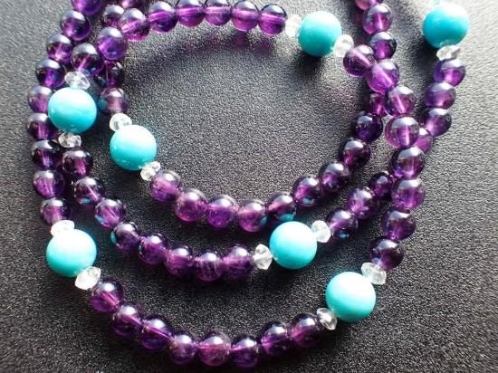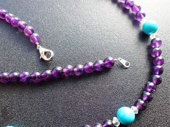サイズ:アメシスト6mm+ターコイス8mm+水晶4mmファセットカット。長さ約60cm。銀色カニツメクラスプ。