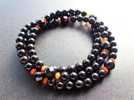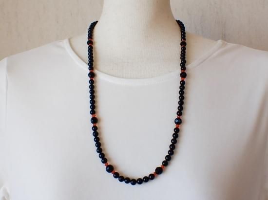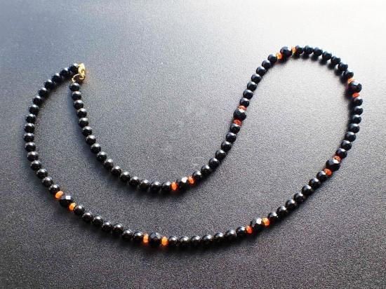サイズ:ブラックオニックス6mm+8mm多面体カット+カーネリアン3mmファセットカット。長さ約60cm。銀色カニツメクラスプ。ブラックオニックスは自分を守る、プロテクトのパワーストーン。自分の内側に気持ちを向けることでインスピレーションを汲みだせたり、気持ちを整理してものごとを他方面から検討するのに役立てられます。黒色のアクセサリーは都会的で、知的で、シャープな自分を演出するのに役立てられます。