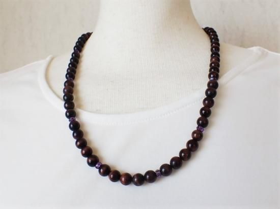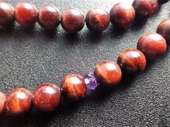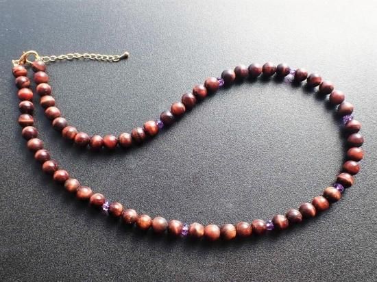 サイズ:レッドタイガーアイ8mm+アメシスト4mmファセットカット。長さ約50cm。金色カニツメクラスプ。 天然石ファンならではの、大地への思いを込めたネックレスです。レッドタイガーアイの原石はブラジル産と思います。タイガーアイをヒーティング(加熱)して鉄分の酸化を促進させて発色させた色合いです。