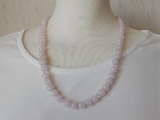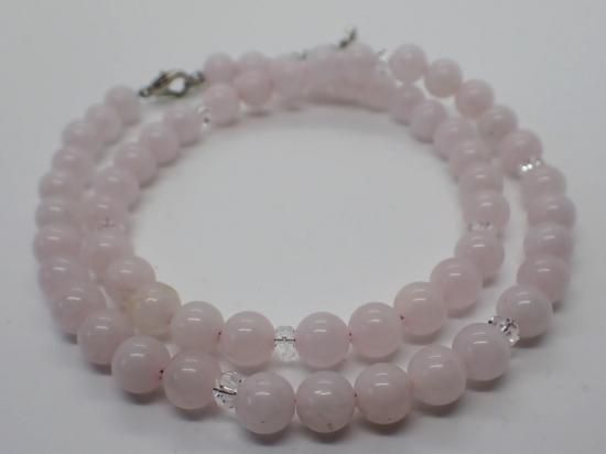 サイズ:ピンクカルサイト8mm+水晶4mmファセットカット。長さ約50cm。銀色カニツメクラスプ。カルサイトは微量のマンガンを含むと、やわらかでやさしい色合いのピンク色に発色します。気持ちをなだめてなごませるヒーリング効果の高い天然石です。この淡い色合いはモニターでの表現が難しいのですが、とても愛らしく淡い桜色をしています。