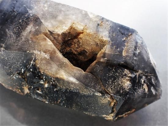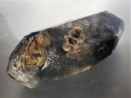 サイズ:約160x75x60mm、877g。ブラジル産でいっかりした構造のダブルポイントです。フラワーエッセンスでは、植物の花のパワーを水に転写して、それをホメオパシーのように希釈して用います。花弁の代わりに鉱物を用いたものをジェムエッセンスなどとよんでいます。このスモーキークォーツでは窪みに水を溜めることで、ジェムエッセンスの原料を生産できます。神聖な感触がことのほか強い原石です。