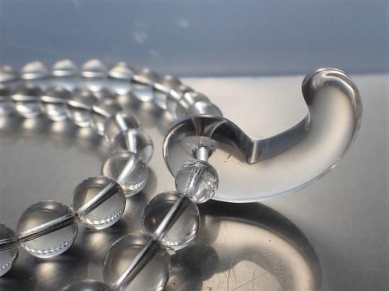 サイズ:約10mm玉、勾玉約40x23x10mmを3個、全長約75cm。金色カニツメクラスプ。代金の内訳は水晶ネックレス14,000円。水晶勾玉4,000円が3個で12,000円。合計26,000円の5割引。勾玉は見本に置いてあった製品です。現品限りで再制作できません。水晶ビーズはよく見ると小さなクラックがあるものを含んでいます。