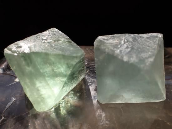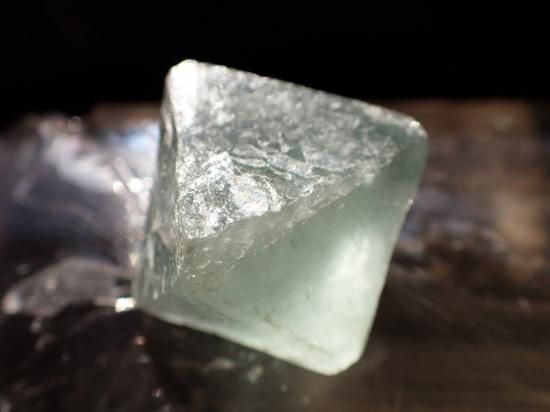 サイズ:約23-37mm。8面体はピラミッドを上下に合わせた形。写真に写っている底辺3cm前後の品を5個1セットでお送りします。個別販売はしていません。この形状は天然の結晶ではなくて、劈開面に沿って人為的に割りだしたものだそうです。フローライトの色味は妙に液体っぽいところがあって、石のなかへ入るようなつもりになって眺めていると、南のクニの珊瑚礁の海や、密林の夜の色に出会えます。サンドペーパーでていねいに磨くと高価な宝石と同じように美しい色合いになります。