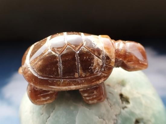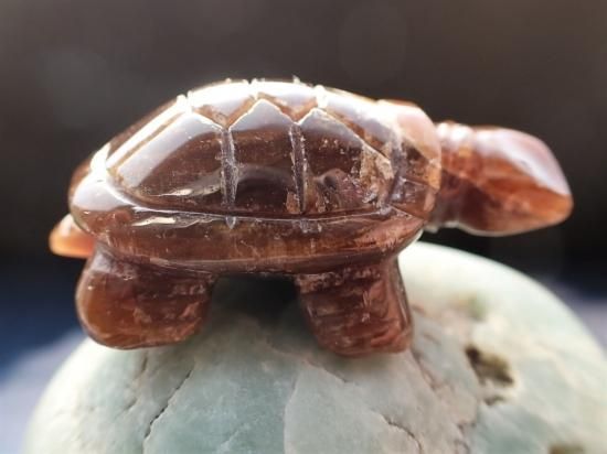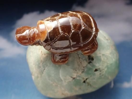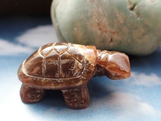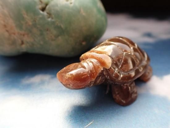 サイズ:約40x24x25mm。 亀は縁起のいい動物で、根付けなどにした彫像を持ち歩いたり、応接間などに亀の彫刻を飾るとお金持ちになるといわれてきました。(写真の原石は製品に付属していません。)