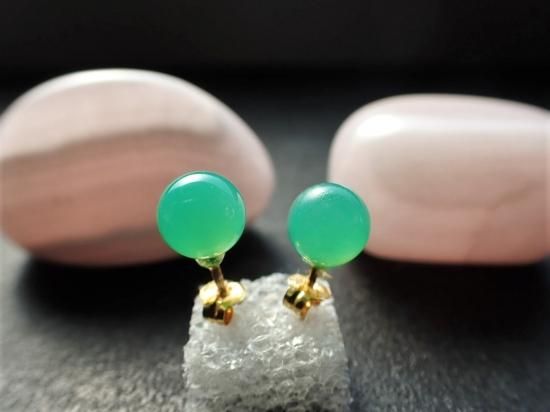 サイズ:約6mm丸玉。ポストの長さ約9mm。ポストもキャッチも18kゴールドを使用しています。クリソプレースはオーストラリア産、アップルグリーンの色合いがとびっきり美しいジェムグレードの高級品を使用しています。。国内メーカーのピアスパーツを仕入れて自社で制作しました。シンプルなデザイン、きれいな色合いのピアスですので、いつまでも飽きることなく愛用できます。