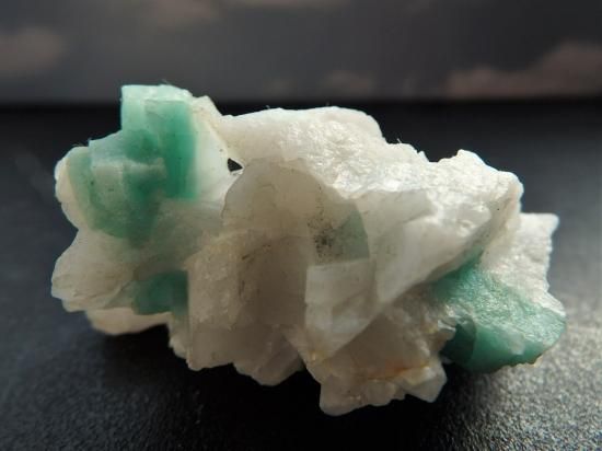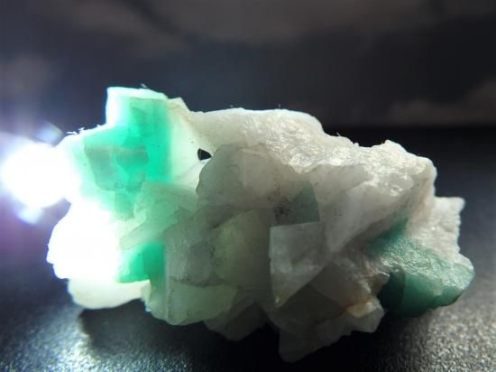 サイズ:約55x28x26mm、41g。結晶は約6x4mm。コロンビア産のエメラルド結晶です。石英の母岩に明るく濁りのないエメラルドが数本埋もれていて、眺めているとすがすがしい気持ちになります。