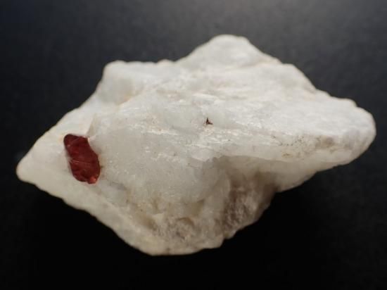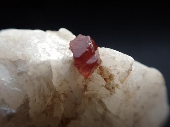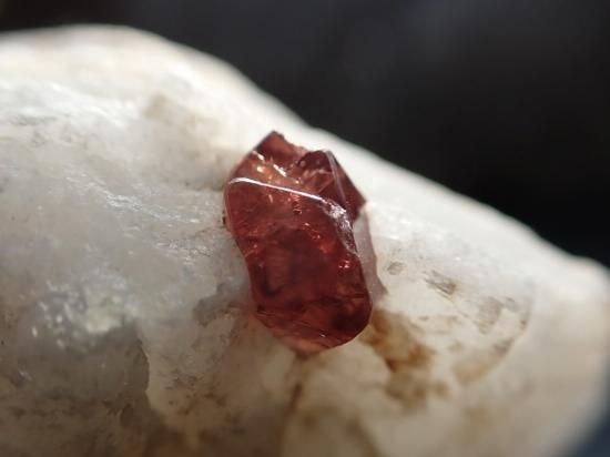 サイズ:約50x40x27mm、63g。パキスタン。レッドスピネルとルビーは色合いも形状もにていて判別しがたいものがありますが、こちらはスピネル(尖晶石)です。半分は母岩に埋もれて全体像を見定められないのですが、理想的なスピネル結晶はピラミッドを上下に重ねた形、均整のとれた八面体をしています。