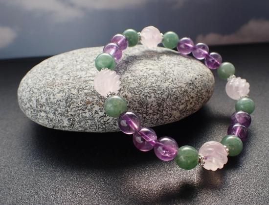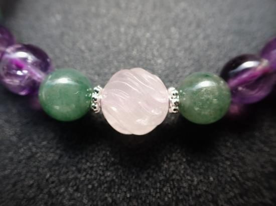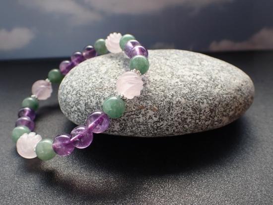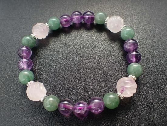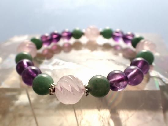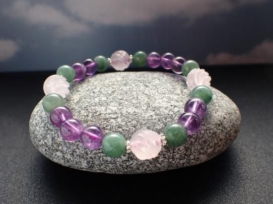 サイズ:ローズクォーツ螺旋カット約10mm、アメシストとグリーン・アベンチュリン8mm。内径約16cm。在庫数3点(再制作可能)。梅から桃、桜へと木々の花が移ろい、花壇では紫や白、黄色の草花がにぎわう季節。うららかな日差しに気分もほぐれて嬉し楽しの時間を送れるよう、春ブレスレットを作ってみました。