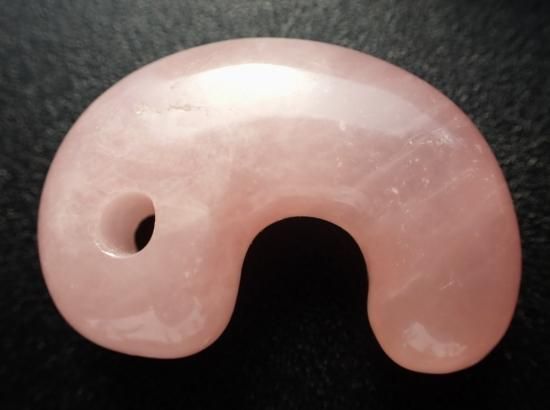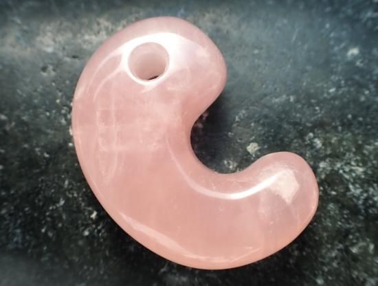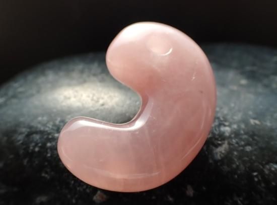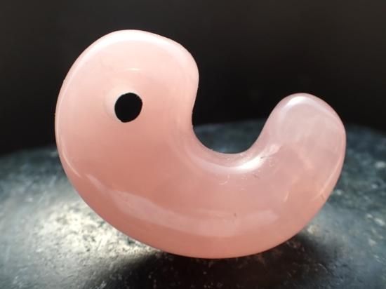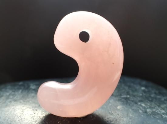 サイズ:約38x26x10mm。アフリカ産のことのほか色合いの美しいローズクォーツから本勾玉を作りました。ピンク色は女性の色という先入観から、ローズクォーツは女性のための癒しの宝石と思われがちですが、この宝石は男性にとっても、内なる女神的要素を育てて、恋人や異性の友人を得やすくしてくれるという特色もあります。男女ともに過去の痛みを癒し、明るく元気に振るまえるよう気持ちを整えてくれます。