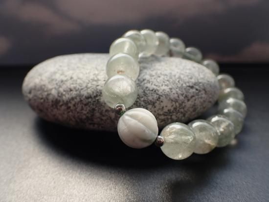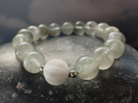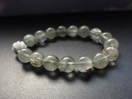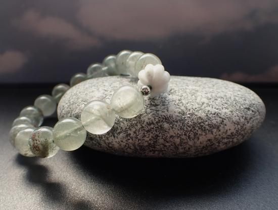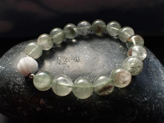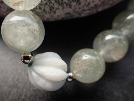 ガーデンクォーツとよべるほど多くはありませんがクローライト(緑泥石)などが内包された水晶ビーズを使用しています。水晶は内包物があるとインパクトも強くなります。クローライト入り水晶は水晶ファンに人気の的です。