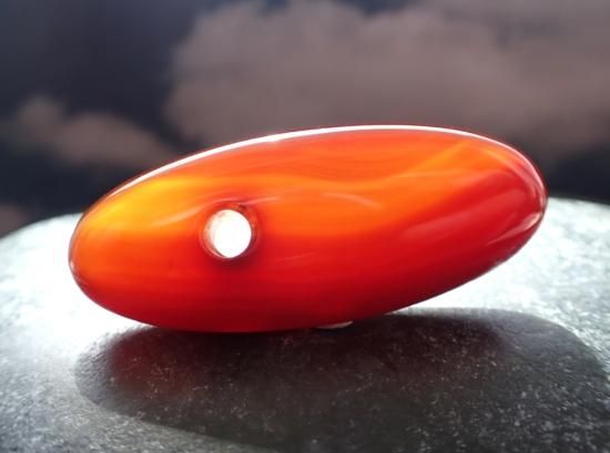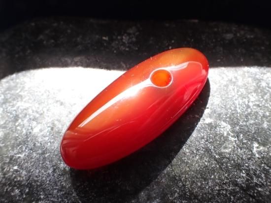 サイズ:約50x20x11mm。ブラジル産原石から制作しました。レッドアゲートの朱色は古来「辟邪(へきじゃ)の赤」とされてきました。外出先での事故を避ける、不運なめに遭わないようにする、邪霊や悪霊たちの介入を遮断する、他者からの中傷・嫉妬・非難・悪意を回避するなどが辟邪の意味です。レッドアゲートはネガティブな要素に邪魔されず、目的へと向かって情熱を注げるよう手助けしてくれる守護石です。写真の製品をお送りします。最後の写真はロービキ紐を付けた場合のイメージ写真です。