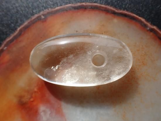 サイズ:約35x18x10mm。パキスタンのカラコルム山系で採掘されたヒマラヤ水晶原石から制作した当社のオリジナル製品です。無傷ではありません。クラックやクラウドのある水晶は、撮影すると全体が傷だらけのように見えますが、透明部分の多い原石を使用しています。最後の写真はロービキ紐を付けた場合のイメージ写真です。
