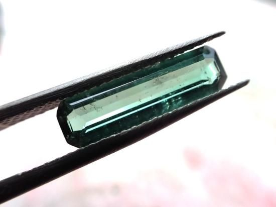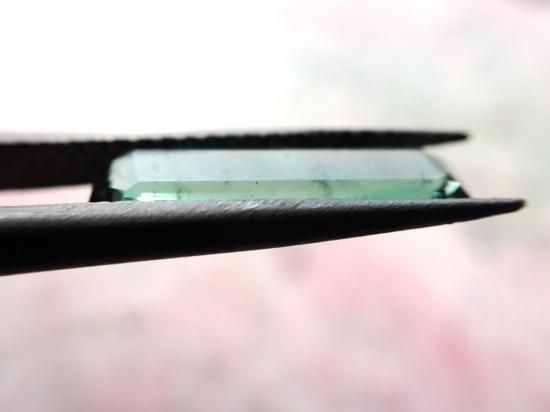 サイズ:約16x4.5x2.5mm、2.1ct 青みのある緑色、ステップカットのルースです。すがすがしく清楚な色合いをしています。パキスタン産柱状結晶を自社カットしました。無傷ではありません。背景の原石は製品に付属していません。