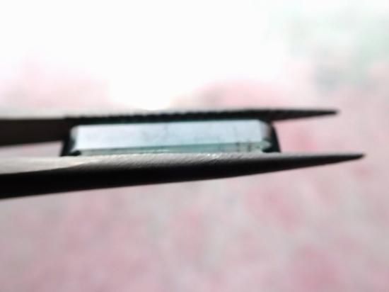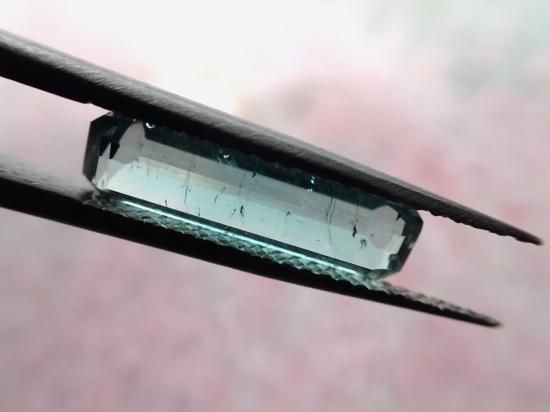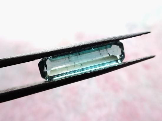 サイズ:約17x4.5x3.3mm、2.5ct 青みのある緑色、ステップカットのルースです。すがすがしく清楚な色合いをしています。パキスタン産柱状結晶を自社カットしました。無傷ではありません。背景の原石は製品に付属していません。