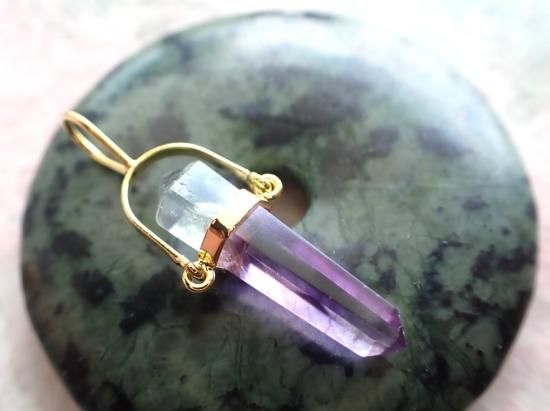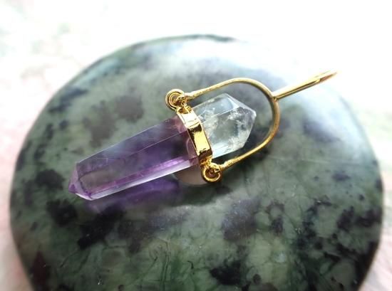 天然石ポイントの長さ約24mm。「世界で一番可愛いペンジュラム」のアクアマリン+アメシスト・バージョンです。無傷ではありませんが、ブラジル産アクアマリンをぜいたくに使っています。
