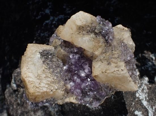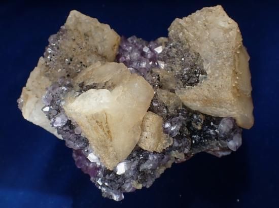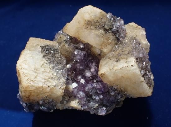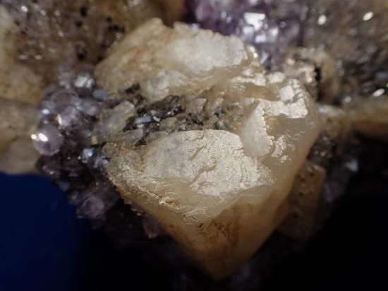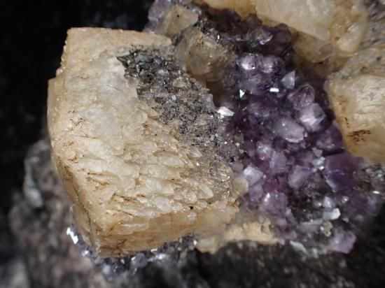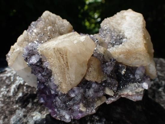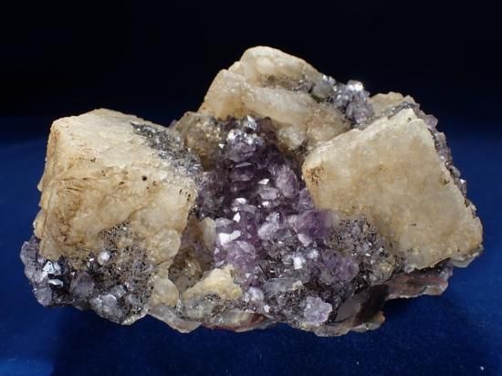 サイズ:約115x108x54mm、838g。ブラジル産。四角いカルサイトと小粒アメシストからなるクラスターです。この標本以外にはこうした形状をみたことがないので、貴重な逸品と思います。