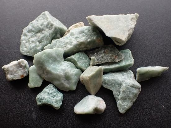 サイズ:約10-35mm。ミャンマー産翡翠原石のチップです。100gをセットにしてお届けします。おまけしてあります。彫刻品製作のために打ち欠いた原石の残りです。軽くタンブラーにかけてあります。未染色未処理品です。30年ほど前に国内の翡翠ディーラーから仕入れたもので、通常はマーケットにでることのない品です。全体的に緑味の強い原石を使用しています。国産翡翠原石では見かけることの少ない貴重な色味です。サムネールボックス・コレクション用に保管して着ました。