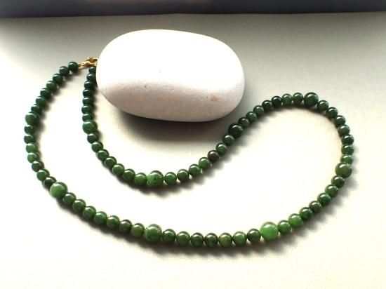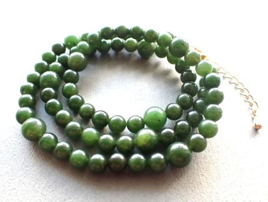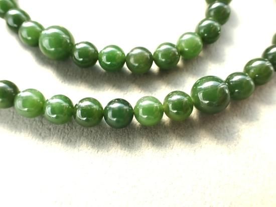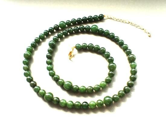 サイズ:ネフライト8&6mm、金色5cmアジャスタ、全長約50cm。原石はカナダ産。当社で注文制作したビーズから制作しました。在庫数2本。