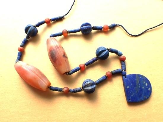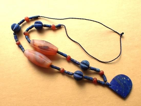 サイズ:紺色の紐を含む全長約80cm、天然石部分は片側約25cm、カーネリアンビーズは約43x18mm。ラピスラズリはアフガニスタン産、無染色品。ラピスビーズに小さな欠けがみられます。以前に在京していたパキスタンのディーラーから仕入れたネックレスです。アンティーク風にみえますが、紐の状態に使用感がないので新品と思います。
